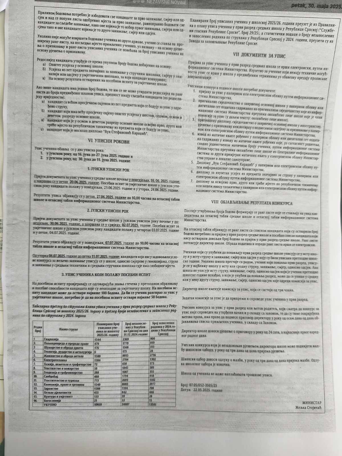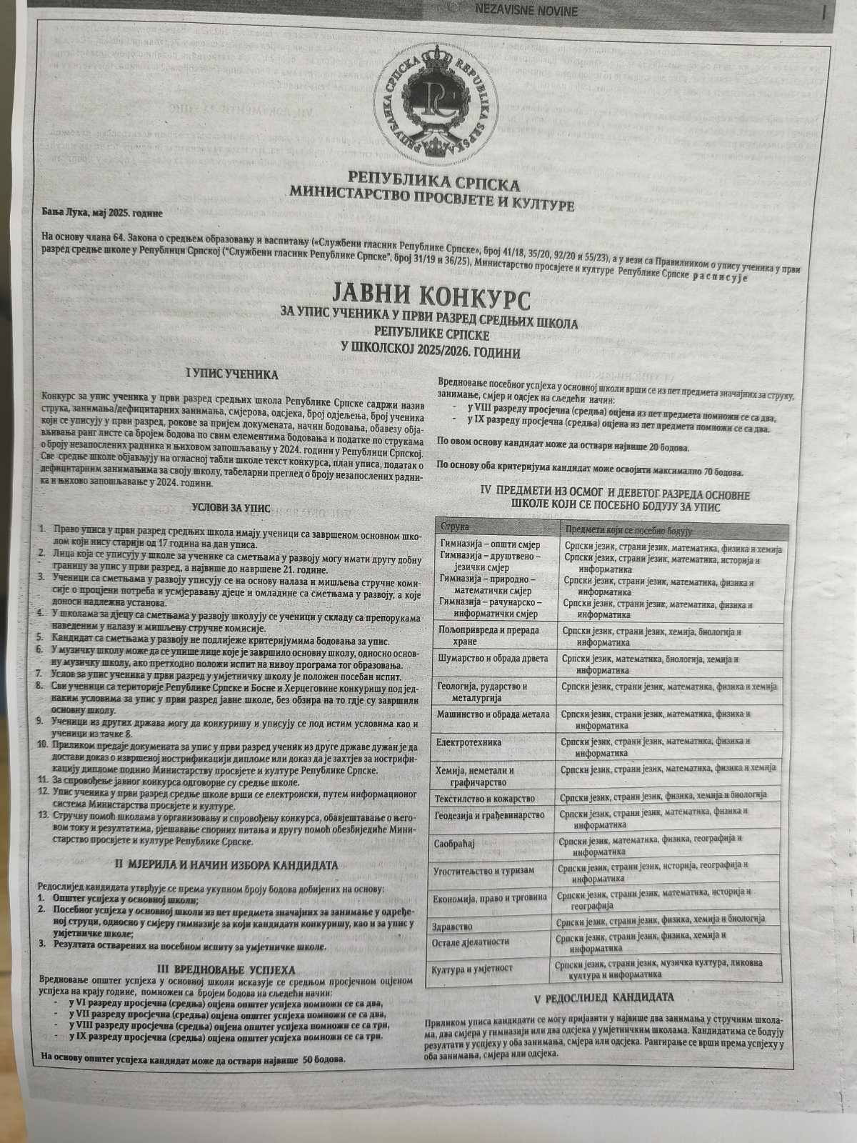 Архива О школи 30 мај 2025 Јавни конкурс за упис ученика у први разред средњих школа у школској 2025/2026. години Штампа Ел. пошта https://www.youtube.com/watch?v=j-3zndBe1qo https://eupis.edukom.org/srednje-skole Претходна Следећа